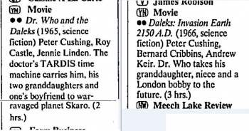 During the two weeks that Frontier in Space and Planet of the Daleks screened, YTV scheduled the two Peter Cushing Dalek movies again, on Sundays at 2pm, with an early Monday morning repeat for both.