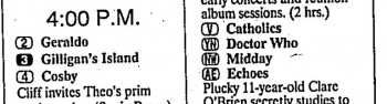 The Stream Two run opened with repeats of the season 25 and 26 Sylvester McCoy serials. With no story titles available in the newspapers, we cannot tell if the stories aired in the same out of order sequence as before, or in production order, or in correct story order. (For the sake of this analysis, we will assume YTV adopted the production order in our Airdates guide. Please drop us a line if you can shed some light on what the actual screening order was!)