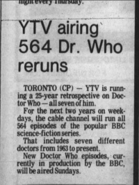 Early print publicity about the acquisition of the series stated that YTV had purchased 564 episodes. This included 17 William Hartnell stories (76 episodes); five Patrick Troughton stories (30 episodes); the 41 Tom Baker serials (172 half hours); 20 Peter Davisons (with The Five Doctors and Resurrection of the Daleks both as 4-parters; equivalent of 74 episodes); eight Colin Bakers (with season 22 in its 25 minute edits; equivalent of 44 episodes); and the 12 Sylvester McCoy adventures / 42 episodes.